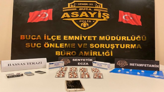 Buca İlçe Emniyet Müdürlüğü'ne bağlı Narko Alan ekipleri, ilçede uyuşturucu madde ticareti yapan H.G. isimli şüpheliyi düzenlenen operasyonla yakaladı. Satışa hazır ve 8 ayrı pakette toplam 10.11 gram 'Metamfetamin' uyuşturucu maddesi, epilepsi hastalığı tedavisinde kullanılan 112 sentetik ecza hap ve hassas terazi ile yakalanan H.G., gözaltına alındı. Ayrıca, H.G.'nin işyerinde yapılan aramada plakasız motosiklet bulan ekipler, yaptıkları sorguda motosikletin çalıntı olduğunu tespit etti.