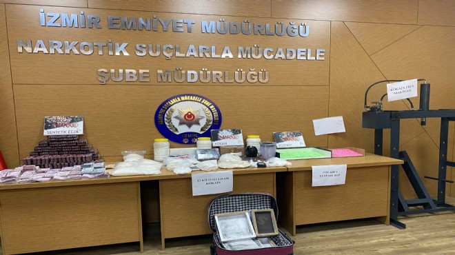 İzmir Emniyet Müdürlüğü Narkotik Suçlarla Mücadele Şube Müdürlüğü ekipleri, istihbarat çalışmasıyla Karşıyaka ilçesinde bir evde uyuşturucu imalatı yapıldığını ve çok miktarda uyuşturucu madde bulunduğunu tespit etti. Yapılan teknik ve fiziki takibin ardından düzenlenen operasyonda evde ve otomobilde arama yapıldı. Narkotik köpeği Rota'nın da kullanıldığı aramalarda 13,5 kilo kokain, 7 bin 731 adet ecstasy hap, 6 bin 272 kırmızı ve yeşil reçeteye tabii sentetik hap, 5 kilo metamfetamin, 2 hassas terazi, 2 ruhsatsız tabanca, 793 tabanca mermisi, 30 uzun namlulu silah fişeği, 1 uyuşturucu madde baskılamasında kullanılan makine ve uyuşturucu madde ticaretinden elde edildiği değerlendirilen 540 bin 300 lira ele geçirildi. Operasyon kapsamında dağıtıcı olduğu ve torbacı olarak tabir edilen sokak satıcılarına uyuşturucu temin ettiği belirlenen F.Y.B. gözaltına alındı.