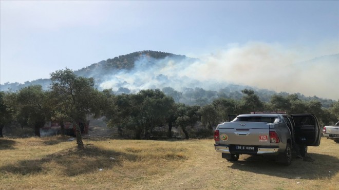 Rüzgarın da etkisiyle büyüyen yangına, İzmir Orman Bölge Müdürlüğüne bağlı 2 uçak, helikopter, 7 arazöz ve çok sayıda ekip sevk edildi.