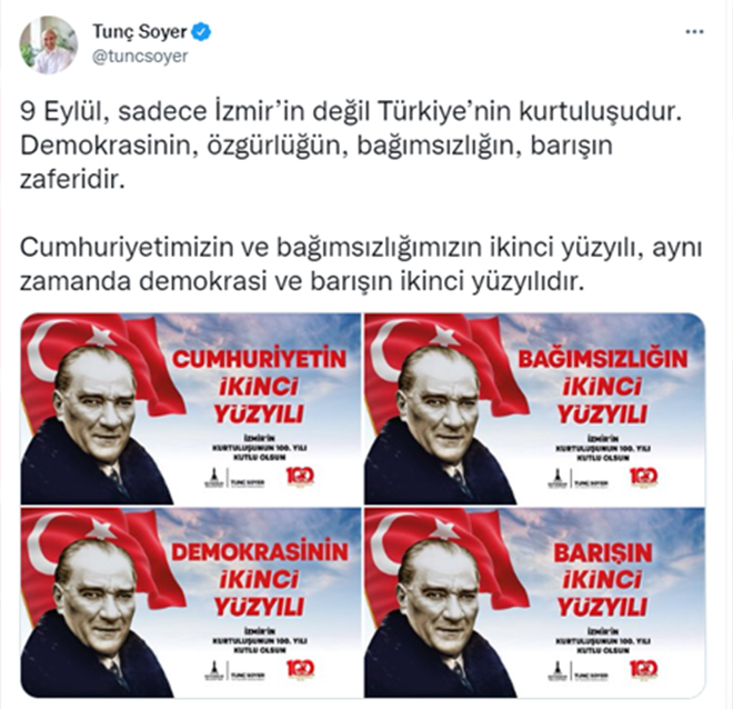 CHP’li İBB Başkanı Tunç Soyer; 9 Eylül İzmir’in Kurtuluşu’nu “ Barışın ikinci yüzyılı’ sloganıyla kutlayarak tarihi bir gaflete imza atmıştır. Tüm vatanseverlerin tepki gösterdiği ve gelecek nesillerin de kınayacağı bu yaklaşım; Türkiye Cumhuriyeti var oldukça sorgulanacaktır!