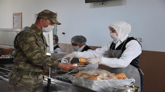 Yemekhaneye ise askerlerin ateşi ölçülerek içeri alınıyor. Sosyal mesafeyi korumak için her masada bir personel oturuyor. Yemek dağıtımı yapan personelin maske, eldiven ve bone takması titizlikle takip ediliyor. Yemek yemek için gelen personelin en az 20 saniye ellerini yıkaması sağlanıyor.