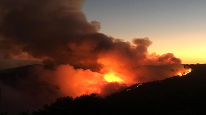 Karabağlar Tırazlı Mahallesi'nde geçen pazar günü saat 13.00 sıralarında başlayan orman yangını, saatteki hızı zaman zaman 60 kilometreyi bulan rüzgarın da etkisiyle hızla büyüdü. Menderes'ten Ürkmez ve Seferihisar ilçesi yönüne kadar olan yaklaşık 15 kilometrelik alana yayılan yangının ekiplerin aldığı önlemlerle köylere ulaşması engellendi. Yangının başlangıcından beri bölgede bulunan ve dün gece boyunca da söndürme çalışmalarına katılan Tarım ve Orman Bakanı Bekir Pakdemirli, gece görüş sistemi takılı helikopterden ekipleri koordine etti. Yangın, rüzgarın de etkisini azaltmasıyla birlikte kırsal Beyler ile Çatalca mahalleleri yakınlarında yoğunlaştı. 500 hektarlık alanda etkili olan yangını söndürme çalışmalarının 20 helikopter, 200 arazöz ve orman işçileri ile sürdüğü bildirildi.