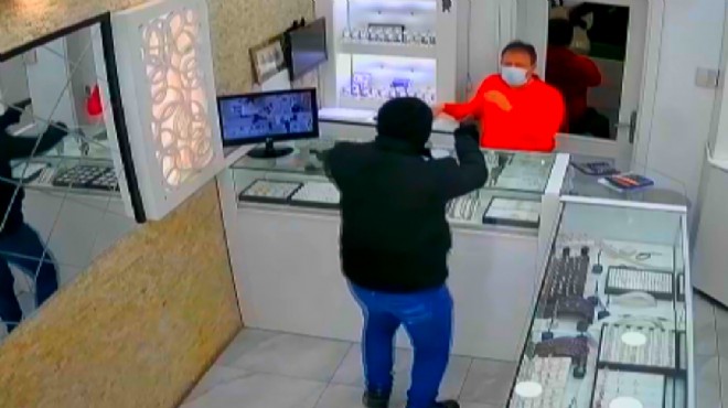 İzmir'in Bornova ilçesindeki kuyumcu dükkanında altınların gasbedilme anı, iş yerindeki güvenlik kamerasına yansıdı.