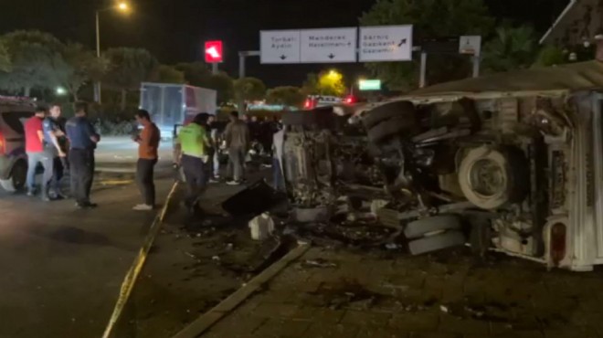 Kamyonette sürücüsü Fehmi Özparıltılı ile araçta sıkışan eşi İnci Özparıltılı ve 8 aylık oğlu Özkan Özparıltılı yaralandı. Yarış halinde olan 35 BOS 208 plakalı otomobil ise demir korkuluklara çarparak durdu.