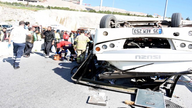 Kaza, dün saat 10.00 sıralarında, Bayraklı'daki Şehir Hastanesi inşaatının bulunduğu yerdeki yan yolda meydana geldi. Bayraklı'dan aldığı down sendromlu öğrencileri, aileleri ve öğretmenleriyle birlikte Örnekköy Mesleki Gelişim Merkezi'ne götüren Zülfikar Yüksel yönetimindeki 35 AEM 253 plakalı servis midibüsünün, iddiaya göre, freni boşaldı. Yüksel'in kontrolünden çıkan midibüs, beton bariyerlere çarparak, karşı şeride geçti, Önder Acılar yönetimindeki 35 KF 8463 plakalı otomobile çarptıktan sonra devrildi. Kazada, midibüsteki down sendromlu çocuklar, bazılarının yakınları, eğitimciler ve sürücüler dahil toplam 34 kişi yaralandı. İhbar üzerine, olay yerine sağlık ve itfaiye ekipleri ile polis ekipleri sevk edildi. İlk müdahaleleri kaza yerinde yapılan yaralılar, ambulanslarla çevredeki hastanelere kaldırıldı.