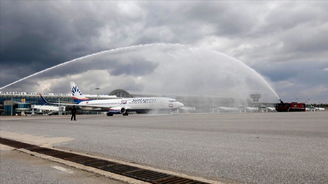 SunExpress'ten yapılan açıklamaya göre, Adnan Menderes Havalimanı'nda birçok turizm profesyonelinin de katıldığı ilk uçuşa özel pistte su takı seremonisi düzenlendi.