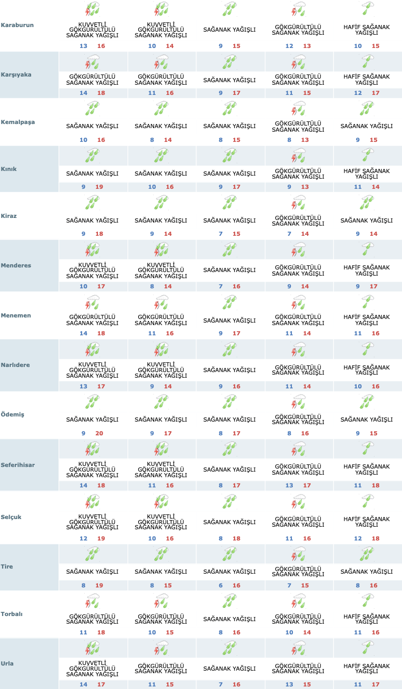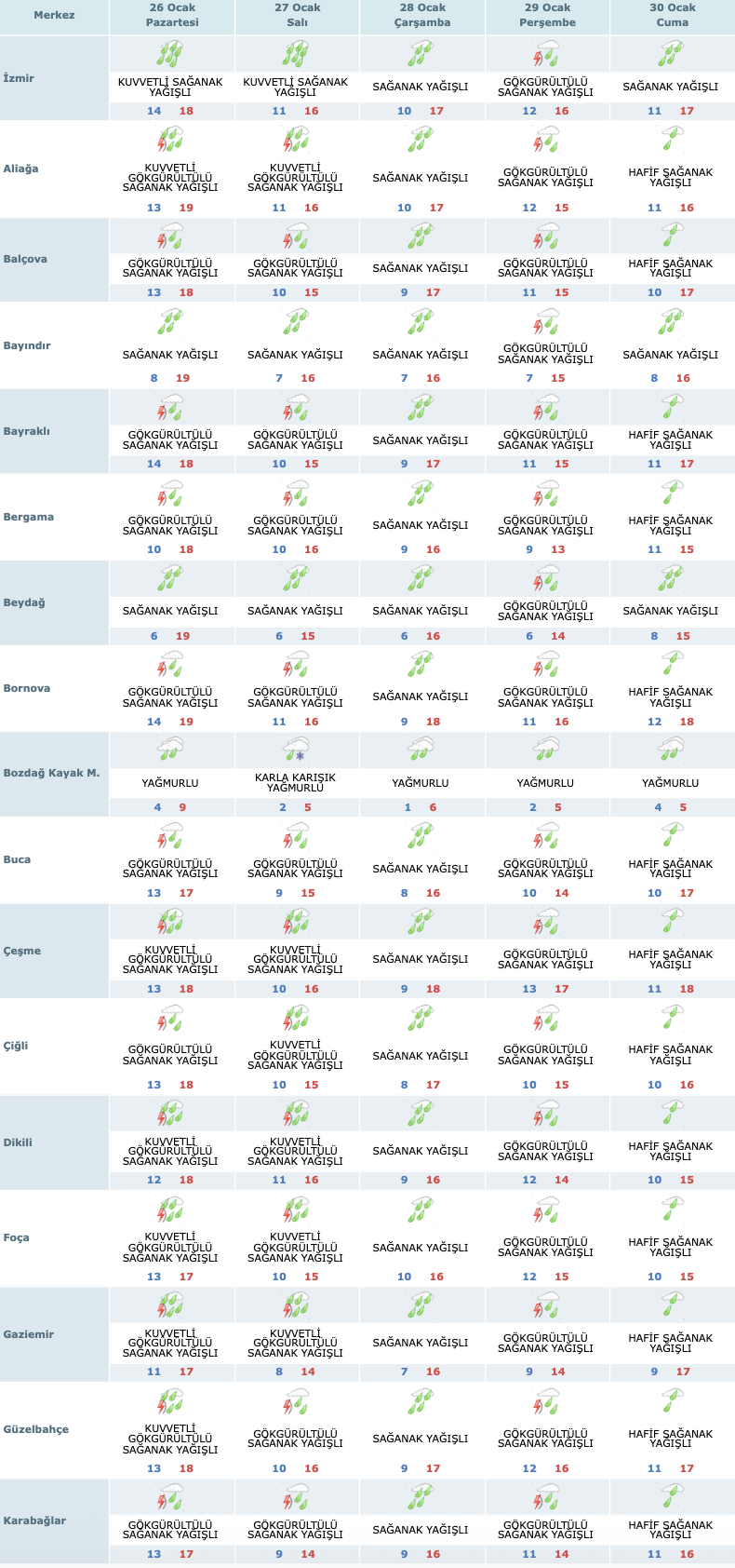 Meteoroloji verilerine göre İzmir merkez ve çevresinde pazartesi ve salı günleri 21–50 kilogram/metrekare aralığında kuvvetli sağanak ve gök gürültülü sağanak yağış bekleniyor. Çarşamba günü yağışların sağanak şeklinde süreceği, perşembe günü gök gürültüsünün yeniden etkili olacağı, cuma günü ise yağışların hafifleyeceği tahmin ediliyor. Sıcaklıkların gece 9–12, gündüz 15–18 derece arasında seyretmesi öngörülüyor.