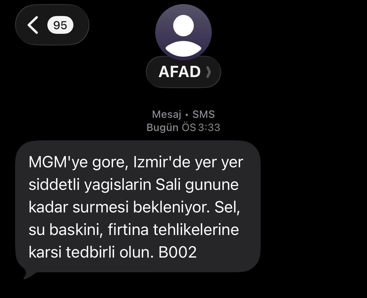 AFAD, 31 Ocak 1 Şubat tarihleri için vatandaşlar uyarıda bulundu. Uyarıda, olası sel, su baskını ve fırtına risklerine karşı vatandaşların dikkatli ve tedbirli olmaları istendi. AFAD'dan gönderilen uyarı mesajında "MGM'ye gore, Izmir'de yer yer siddetli yagislarin Sali gunune kadar surmesi bekleniyor. Sel, su baskini, firtina tehlikelerine karsi tedbirli olun" denildi.