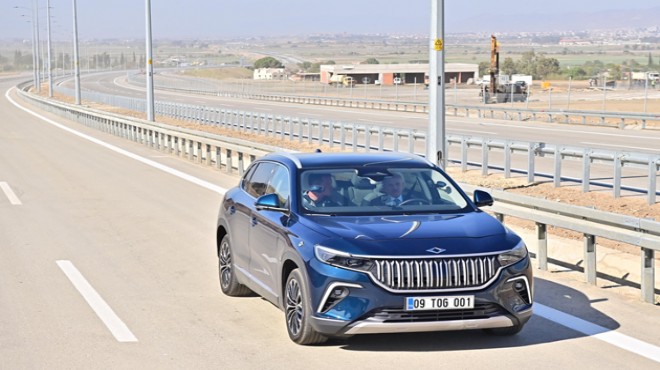 Bakan Uraloğlu konuşmasının ardından oyuncu Alp Kırşan'la bindiği TOGG'u açılan yolda kullandı. (AA)