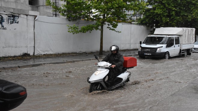 İzmir'de öğle saatlerinden itibaren etkili olan dolu ve sağanak, çeşitli bölgelerde su birikintilerine neden oldu. Sürücüler trafikte zor anlar yaşadı.