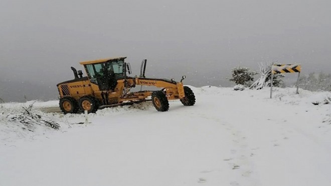 İzmir'in Ödemiş ilçesinde yüksek kesimlerde yağan karın ardından belediye ekipleri yolları açık tutmak için çalışma yürütüyor.