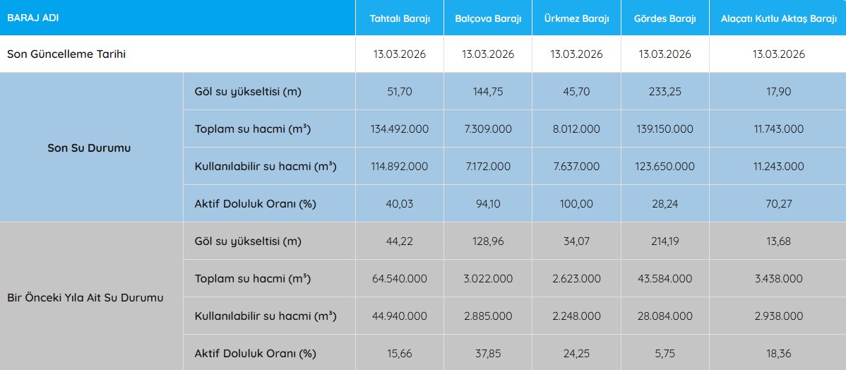 İZSU’nun 13 Mart 2026 tarihli verilerine göre İzmir’in en önemli içme suyu kaynaklarından Tahtalı Barajı’nda aktif doluluk oranı yüzde 40,03 olarak ölçüldü. Tahtalı Barajı’nda yağışların mola vermesi ile artış hızı düştü. Barajda 12 Mart günü doluluk oranı 39,95 olarak ölçülmüştü.