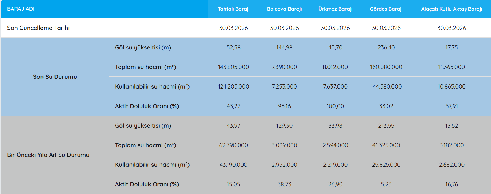 (30 Mart 2026 Barajların Durumu)