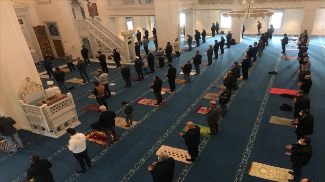 Bornova ilçesinde bulunan Bilal Saygılı Camii ve Külliyesinde de sosyal mesafe ve maske kurallarına uygun kılınan namazın ardından vatandaşlar duaya iştirak etti. (AA)