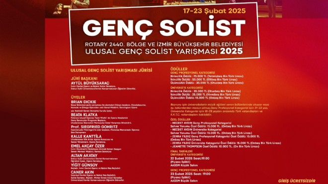 İzmir Büyükşehir Belediyesi, Rotary Bölge 2440 ve Dokuz Eylül Üniversitesi Devlet Konservatuvarı iş birliği ile 17-23 Şubat tarihlerinde Ulusal Genç Solist Yarışması düzenlenecek. İzmir Büyükşehir Belediyesi Ahmed Adnan Saygun Sanat Merkezi’nde (AASSM) yapılacak bu önemli yarışmayla genç opera solistlerinin hem sanatseverlere tanıtılması hem de Türkiye ve dünyadaki sanat kurumlarının kapılarını aralama olanaklarını bulması amaçlanıyor. Önemli isimlerin yer aldığı jüri, şehir dışından ve Kuzey Kıbrıs Türk Cumhuriyeti’nden (KKTC) gelen 102 genç sanatçı arasından seçim yapacak. İki ayrı kategoride düzenlenecek yarışmada, final bölümü halka açık ve ücretsiz olacak.