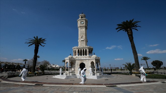 İzmir Büyükşehir Belediyesi Temizlik İşleri Müdürlüğünce görevlendirilen 10 kişilik temizlik ekibi, tarihi saat kulesinde bulunan lavabo, çeşme, meydan etrafındaki oturma alanları ile telefon kulübeleri ve umumi tuvaletlerde dezenfekte işlemi yaptı.