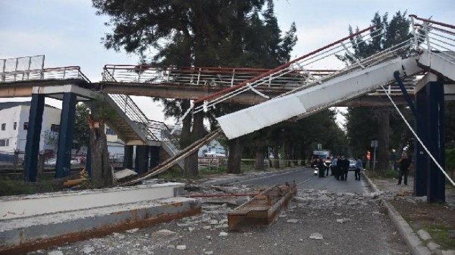 İZMİR - Bornova'nın Ağaçlı Yol mevkisinde, Gıda, Tarım ve Hayvancılık İl Müdürlüğü karşısında bulunan, İzmir Metrosu'nun Sanayi ile Bölge istasyonları arasındaki yaya üst geçidine, dün akşam saatlerinde, altından geçen vinç çarptı.