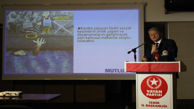 Vatan Partisi İzmir Büyükşehir Belediye Başkan Adayı Rifat Mutlu, düzenlediği basın toplantısında kendi çizdiği karikatürlerinden oluşan bir sunum yaparak 'Mutlu İzmir' projesini açıkladı. Kentin sorunlarını çözümleri ile birlikte slayt gösterisi ile anlatan Mutlu, İzmir'in trafik sorununu, ağzında trafik lambalarını tutan ve kabuğu iç içe geçmiş araçlardan oluşan bir kaplumbağa karikatürü ile işsizlik sorununu; bir kağıdı yere serip etrafına taşlar dizerek kendine ev yapmış bir adam karikatürü ile engelli sorununu; koltuk değnekleri ile bilardo oynayan adam karikatürü ile dayanışma sıkıntısını; denizde boğulan adama can simidi yerine simit fırlatan simitçi karikatürü ile eleştirel bir bakış açısıyla anlattı. Mutlu Kent, Mutlu İnsan, Mutlu Gelecek gibi başlıklarla plan ve projelerin aktarıldığı toplantıya; Vatan Partisi İzmir belediyelerinin adayları, Parti İl Başkanı Erdem Şahin, Genel Başkan Yardımcısı Meltem Ayvalı, Öncü Kadın Genel Başkanı Pınar Gül katıldı.
