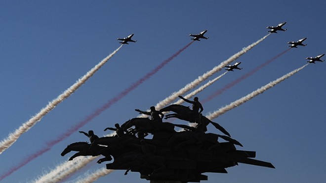 Türk Hava Kuvvetlerinin akrobasi timi Türk Yıldızları ile SOLOTÜRK, İzmir'in düşman işgalinden kurtuluşunun 103. yıl dönümü dolayısıyla hava gösterisi yaptı.