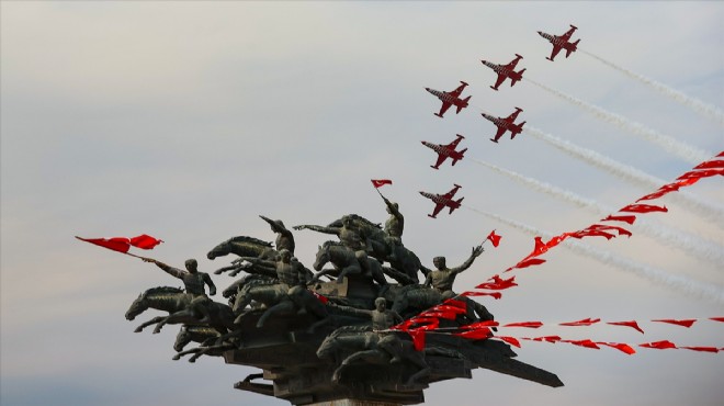 Ay yıldızlı bayrağın gökyüzünü renklendirdiği gösteriyi izlemek için Gündoğdu Meydanı ve Kordon’a akın eden İzmirliler, hatıra fotoğrafları çektirerek unutulmaz anları ölümsüzleştirdi.