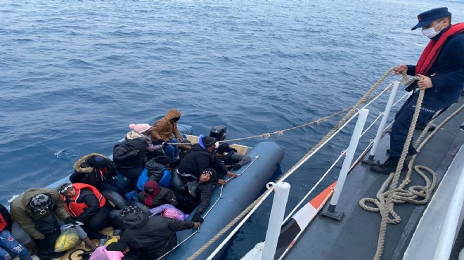 İzmir'in Menderes ilçesinde lastik botta sürüklenen 22 düzensiz göçmen kurtarıldı.