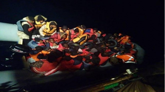 İZMİR - Seferihisar ilçesi açıklarında, yasa dışı yollardan lastik botla Yunan adalarına gitmeye çalışan 64 kaçak göçmen yakalandı.
