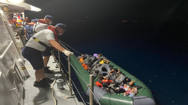 Dikili açıklarında da Sahil Güvenlik Mobil Radarınca tespit edilen ve görevlendirilen Sahil Güvenlik Gemisi tarafından durdurulan hareketli lastik bottaki 35 düzensiz göçmen yakalandı.