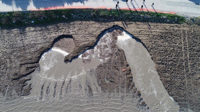 Öte yandan havadan da görüntülenen bölgede suyun yerin altına akmaya devam ettiği görülürken, herhangi bir olumsuzluğun yaşanmaması için çevresine emniyet şeridi çekildi. (DHA)