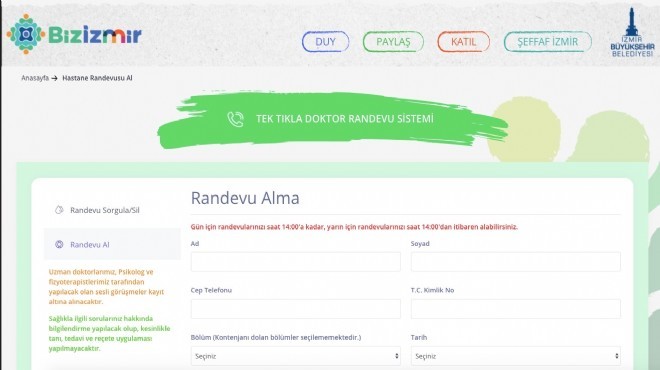Doktor Danışma Hattı'ndan faydalanmak için öncelikle Bizİzmir dijital platformları üzerinden randevu almak gerekiyor. www.bizizmir.com web sitesinin ya da Bizİzmir mobil uygulamasının ana sayfasındaki “Doktor Danışma Hattı” sekmesine tıklayarak ilgili sayfaya gidilebiliyor. Bu sayfada açılan randevu formunda enfeksiyon hastalıkları, dahiliye, kardiyoloji, çocuk hastalıkları, kulak burun boğaz, dermatoloji, kadın doğum, ortopedi, göz hastalıkları, genel cerrahi, plastik cerrahi, fizik tedavi ve psikoloji bölümlerinden biri işaretleniyor. Forum tamamının doldurulmasının ardından hasta randevusunu almış oluyor.