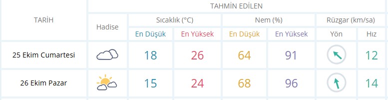 Pazar günü ise parçalı bulutlu ve 25 derece olacak. Gece sıcaklığı ise 15 derece olacak.