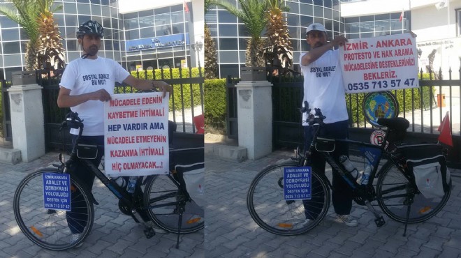 Akbaş yola üzerinde, “Sosyal adalet bu mu? Fikirler ayrı olsa da adalet aynı olmalı” tişörtüyle çıkacak. Bisikletinde ise “İzmir/Ankara Adalet ve Demokrasi Yolculuğu” yazacak. Akbaş, kendisine destek olunması adına telefon numarasını da bisikletine yazdı.