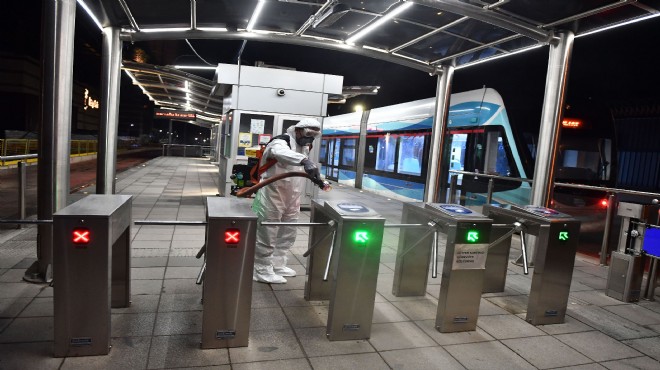 İZBAN, Metro, Tramvay, ESHOT ve İZDENİZ’e ait işletmelerde her gece sabaha kadar temizlik çalışmaları yapılıyor. Hijyen ve sanitasyon belgelerine sahip uzman ekipler, tüm toplu ulaşım araçlarında koltukları temizliyor, zeminleri paspaslıyor, camları ve yan yüzeyleri siliyor. Yolcuların temas ettiği tutamak, korkuluk ve tırabzanlar da dezenfekte ediliyor. Tüm bu işlemlerde, insan sağlığına zararlı olmayan TSE onaylı temizlik ürünleri kullanılıyor.