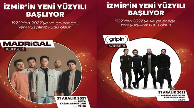 “İzmir’in yeni yüzyılı başlıyor” sloganıyla yeni yıl coşkusunu kentin her köşesine yaymayı amaçlayan İzmir Büyükşehir Belediyesi, 31 Aralık Cuma gecesi usta müzisyenleri ağırlayacak. Cumhuriyet Meydanı’nda 21.00’de “DJ Bey”in performansının ardından 22.30’da 1983’ten bu yana DJ kabininde olan Suat Ateşdağlı sahne alacak. Alternatif rock grubu “Madrigal” ise Buca Kasaplar Meydanı’nda 22.30’da İzmirliler ile buluşacak. Bornova Âşık Veysel Rekreasyon Alanı’nda yine 22.30’da “Gripin”, Karabağlar Uğur Mumcu Parkı’nda ise Feridun Düzağaç konseri var. Yılbaşı eğlencesi video mapping gösterileriyle renklenecek.