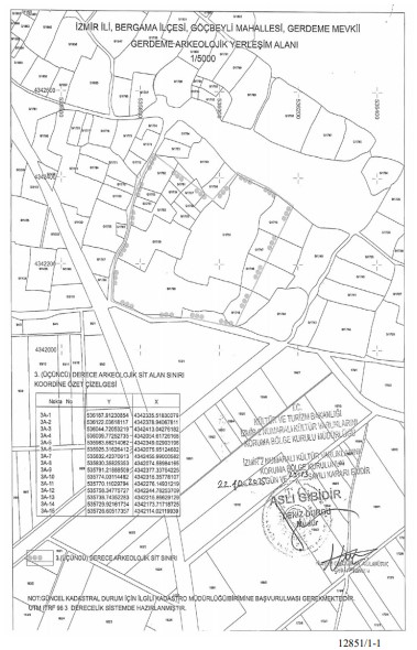 Bergama ilçesi Göçbeyli Mahallesi, Gerdeme Mevkii’nde bulunan tarla niteliğindeki ve şahıs mülkiyetindeki 17 komşu parsel ve tapulama harici bölgede kalan alanlar ‘Gerdeme Arkeolojik Yerleşim Alanı’ adı ile 3. derece Arkeolojik sit olarak tescil edildi.