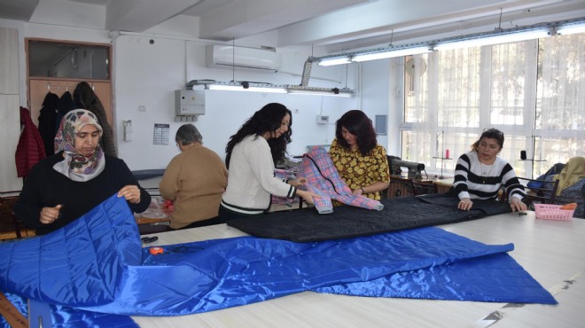Bayraklı Halk Eğitim Merkezi'nde giyim öğretmeni İnci Bandaş ise "Bayraklı'da büyük bir deprem yaşadık. Birçok kursiyerim o depremden etkilendi. Deprem sonrasında, 'Ne yapabiliriz, onları nasıl rehabilite edebiliriz?' diye düşündük ve halk eğitim merkezimizde bu kursu hayata geçirdik. Onlar da kurslara devam ederek bir nebze olsun yaşadıklarını unutmaya çalıştılar. Son yaşanan Kahramanmaraş depreminden sonra da biz hemen deprem bölgesine giysi gönderilmesi için harekete geçtik. Eşofman, uyku tulumu, kışlık içlikler, atkı, bere, çocuk tulumları gibi giysiler üreterek bölgeye gönderdik. Bir çocuğun bile ısınmasını sağlayabildiysek ne mutlu. Şu anda da hala devam etmekteyiz. Her gün 300 kadar ürün gönderiyoruz" diye konuştu.