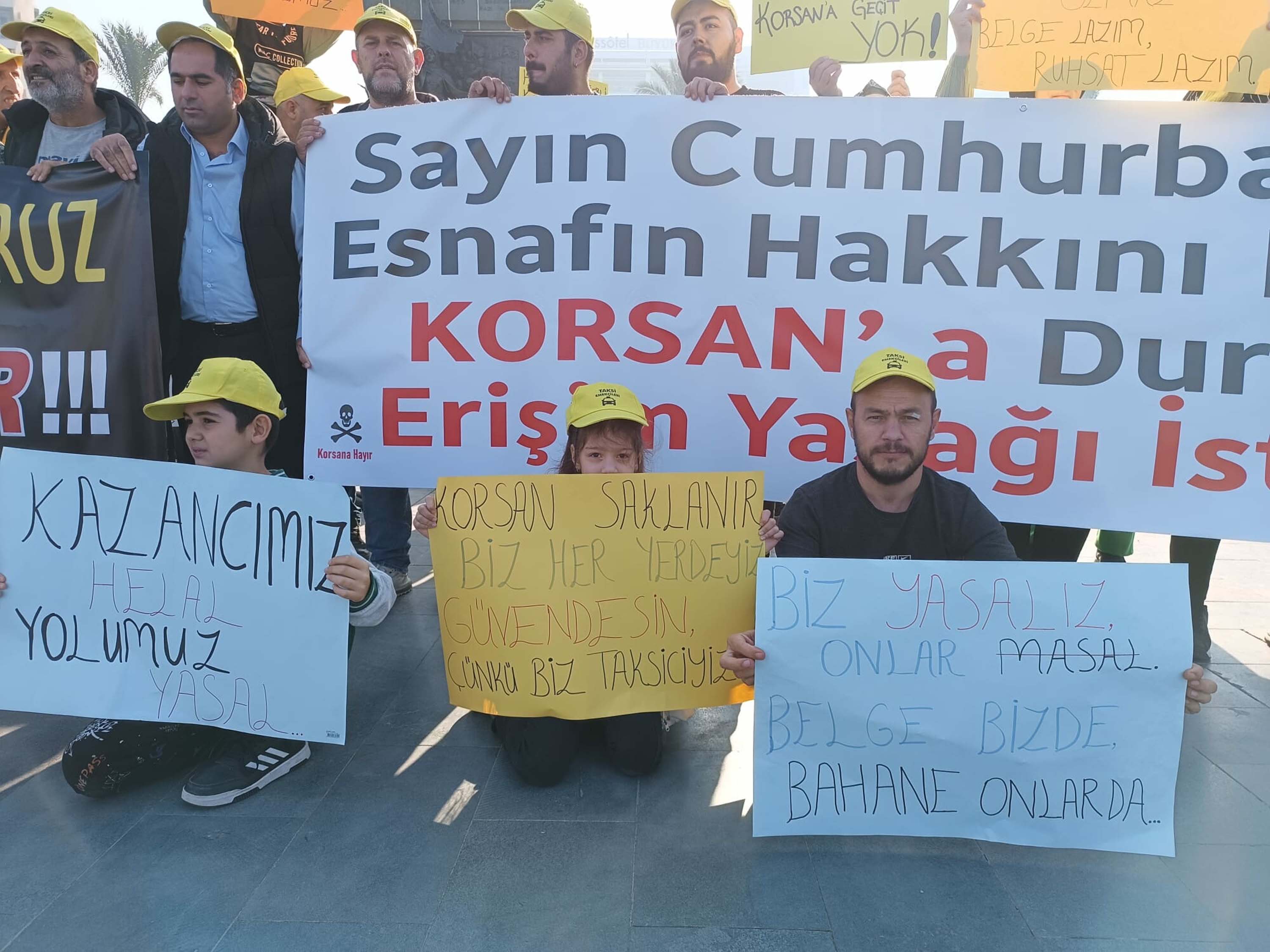 Taksici esnafı, sabah saatlerinde korsan taşımacılığa tepki göstermek için Alsancak Stadı önünde toplandı. Çok sayıda taksi şoförü, kornalarla Şehitler Caddesi'nden Liman Caddesi'ne, oradan da Cumhuriyet Meydanı'na konvoy yaptı. Araçlarına Türk bayrağı asan taksiciler, sahil şeridinde tek sıra halinde park edip kontak kapattı. 'Korsana dur deyin', 'Erişim yasağı istiyoruz', 'Emeğimize sahip çıkıyoruz', 'Sayın Cumhurbaşkanım esnafın hakkını koruyun' yazılı döviz ve pankartlar taşıyan topluluğa, aileleri de destek verdi.