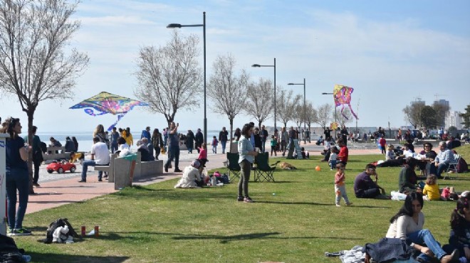 İzmir'de bulutlu ve yağmurlu günlerin ardından hava sıcaklığının 24 dereceyi bulmasıyla güneşin tadı çıkarıldı. Hasırlarını ve sandalyelerini alan birçok aile, tişört giyerek, çocuklarıyla birlikte deniz kenarlarındaki çim alanları doldurdu. Özellikle, Bostanlı Sahili'nde büyük bir kalabalık oluştu. Çocuklar, yanlarında getirdikleri toplarla oynayıp, ip atladı, baharın müjdecisi uçurtmalar mavi gökyüzünü renklendirdi.