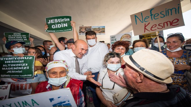 “Susma haykır, JES'e hayır”, “Üzüm, incir, zeytin geleceğimiz”, “Burası jeotermal arsası değil, keçilerin merası”, “Zeytinime dokunma” yazılı dövizlerin taşındığı protestoda Başkan Tunç Soyer, yerel yöneticilerin asli işinin, görev yaptıkları toprakları ve onun kültürünü korumak olduğunu belirtti. Soyer, “İlk işimiz, bu toprakları korumaktır. Çünkü bizim üstlendiğimiz görevler, nöbet görevleridir. Biz nöbetçiyiz. Biz görev süremizin sonunda gideceğiz ama görev süresi içerisinde bize emanet edilen, atalarımızın binlerce yıl boyunca biriktirdikleri değerleri, korumazsak hangi görevi yapmış oluruz? Hangi işi yapmış oluruz? Aslolan, bizden önce de var olup, atalarımızın bize devrettiği bu mirası canla başla korumaya çalışmak. Çünkü bunu yok etmek için, bunun üzerinden kar etmek için, bu toprakları ranta kurban etmek için ellerinden geleni yapıyorlar. Yapmaya da devam edecekler. Onun için varız” dedi.