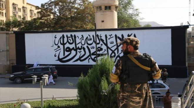 Terk edilen büyükelçiliğin ana giriş kapasının yanındaki duvara ise Taliban bayrağı resmedildi.