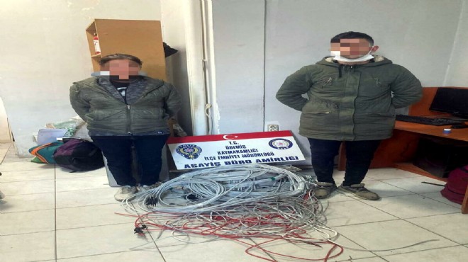 Ödemiş İlçe Emniyet Müdürlüğü Asayiş Büro Amirliği ekipleri, dün akşam saatlerinde ilçedeki özel bir okula hırsızlık amacıyla giren 3 şüpheli olduğu ihbarını aldı. İhbar üzerine harekete geçen ekipler, okulun kablolarını söken S.G. ve İ.A. isimli kadını suçüstü yakalandı. Hırsızlık olayına karıştığı belirlenen diğer şüpheli Ö.A. da saklandığı evde yakalandı. Hırsızlıktan çok sayıda suç kaydı bulunan 3 şüpheli sevk edildikleri adliyede tutuklandı. (DHA)