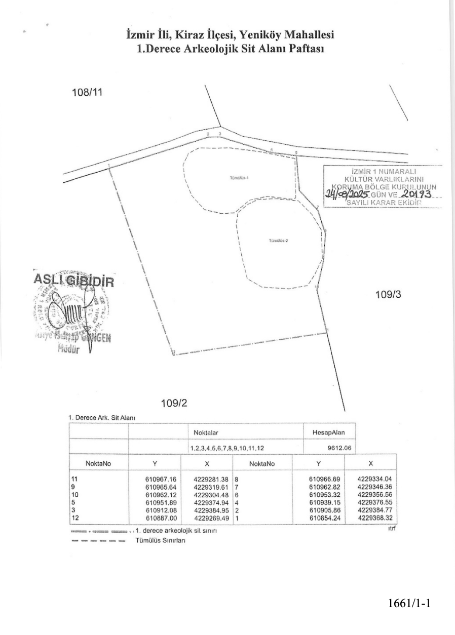 Kültür ve Turizm Bakanlığı İzmir 1 Numaralı Kültür Varlıklarını Koruma Bölge Kurulu’nun 24 Eylül 2025 tarihli yazısıyla, özel mülkiyete ait 109 ada 2 parselde kayıtlı tarla vasfındaki taşınmazda tespit edilen iki tümülüs yapısının bulunduğu alanın sit alanı ilan edilmesine karar verildi.