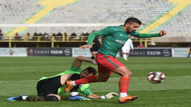 45'inci dakikada sol çaprazdan ceza sahasına giren Karşıyakalı Harun'un şutu yan direği sıyırıp auta çıktı.