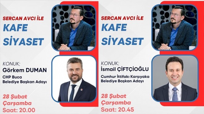Cumhuriyet Halk Partisi’nin (CHP) Buca Belediye Başkan Adayı Görkem Duman saat 20.00’da, Cumhur İttifakı’nın Karşıyaka Belediye Başkan Adayı İsmail Çiftçioğlu ise saat 20.45’ten itibaren Sercan Avcı'nın soruları eşliğinde önemli açıklamalarda bulunacak.
