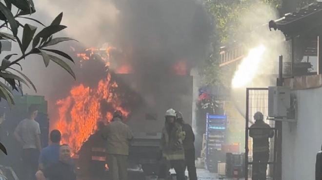 İzmir'in Konak ilçesinde bir markete ait kamyon, çıkan yanında kullanılamaz hale geldi.