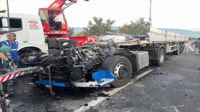 İzmir'de kamyonla çarpışması sonucu kabin bölümü kopan tırın sürücüsü hafif yaralandı.