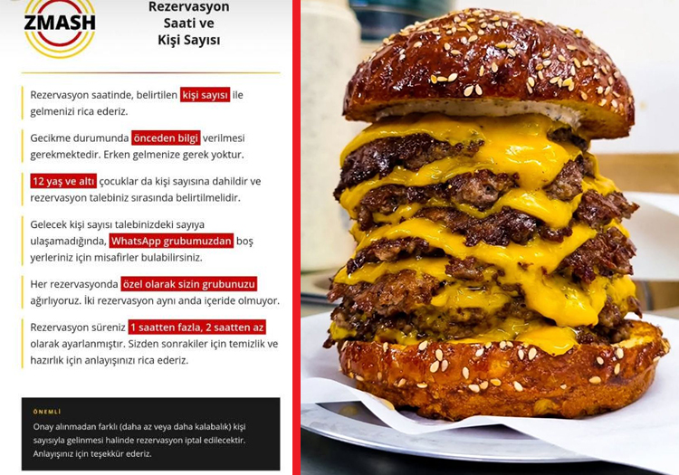 Sosyal medyada, "Zmash Burger" isimli hamburgercinin “referansla” müşteri kabul ettiği, en fazla 10 kişiye hizmet verdiği ve menüdeki bazı ürünler için özel şartlar uyguladığına ilişkin görüntüler yayınlandı.