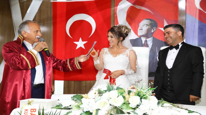 Daha sonra Bayraklı Belediyesi Havuz Düğün Salonu’nda düzenlenen düğün törenine katılan Başkan Hasan Karabağ, Bayraklı Belediyesi Türk Sanat Müziği Korosu Şefi Dr. Halil Altınköprü ve Emine Başateş’in nikahlarını kıydı. Düzenlenen güzel törende çifte ömür boyu mutluluklar dileyen Başkan Karabağ, “Burada müziği seven iki güzel insanın hayatını siz şahitlerin ve misafirlerin eşliğinde gerçekleştiriyoruz. Umarım ömrünüz de müzik gibi güzel olur” dedi. ‘Sanatçıların nikahı müziksiz olmaz’ diyen Başkan Karabağ’a jest yapan sanatçı çift birlikte şarkı söyledi. Daha sonra kıyılan nikahta Başkan Karabağ evlilik cüzdanını geline teslim etti.