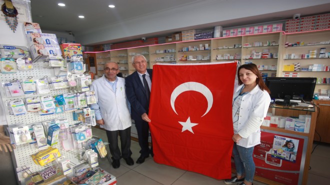 Başkan Muhittin Selvitopu, Başkan Yardımcısı Ceyhan Kayhan ve Meclis Üyesi İsmail Taş ile birlikte Eskiizmir Caddesi başta olmak üzere Yıkık Camii, Bozyaka-Zincirlikuyu bölgesinin tamamını dolaştı. Esnafa hayırlı işler dileyen ve 29 Ekim Cumhuriyet Bayramı'nı kutlayan Başkan Selvitopu, esnafın dükkanlarına ve evlerine asmaları için de Türk Bayrağı hediye etti.