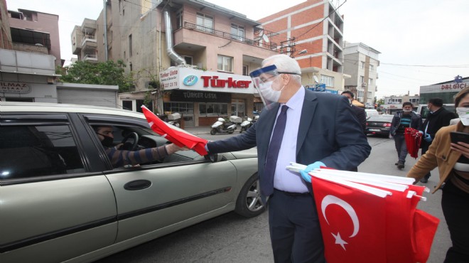 Karabağlar Belediye Başkanı Muhittin Selvitopu, Türk Bayrağı dağıttığı vatandaşlara, “23 Nisan Ulusal Egemenlik ve Çocuk Bayramı'nın 100. yılı coşkusunu hep birlikte yaşayalım” çağrısı yaptı.