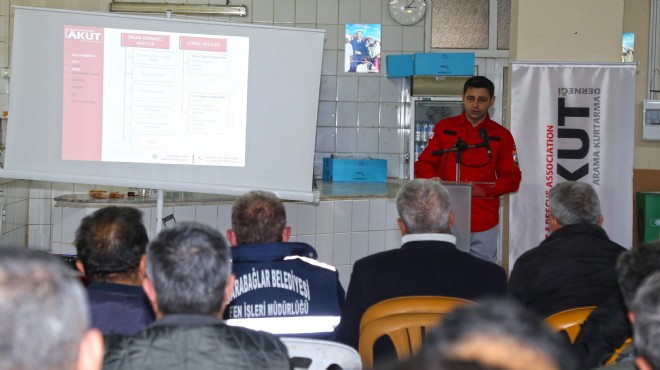 Karabağlar Belediyesi Gediz Asfalt Şantiyesi'nde düzenlenen ilk eğitime, Park ve Bahçeler Müdürlüğü personelinin yanı sıra birim yetkilileri ve başkan yardımcıları da katıldı. Seminerde, deprem, sel ve yangınlarla ilgili sunumlar yapıldı. Deprem, sel ve yangınlara karşı ne gibi önlemler alınması gerektiği, afet durumunda ve sonrasında yapılması gerekenler anlatıldı. Ayrıca eğitim sırasında, Karabağlar Belediyesi Destek Hizmetleri Müdürlüğü'ne bağlı Sivil Savunma Uzmanı Orhan Erdem bilgilendirmelerde bulundu. AKUT Gönüllüsü Murat Aras da, isteyen herkesin gönüllü olarak derneğe üye olabileceğini belirtti.
